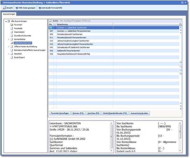 Saldenlisten zeigen den aktuellen Kontenstand (Saldo), die Eröffnungsbilanz (Saldovortrag) sowie die kumulierten (aufsummierten) Monats- und Jahreswerte im Soll und Haben für jedes Konto. Übersichtslisten ermöglichen die Ausgabe von Jahres- und Vorjahressalden, Periodenentwicklungen sowie den Druck einer Hauptabschlussübersicht.