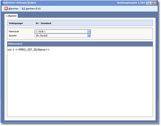 << Hier KLicken um eine Inhaltsübersicht anzuzeigen >> Navigation: Finanzbuchhaltung > Stammdaten > Basisdaten > Mahngruppen > Mahngruppe erfassen/ändern > Die Karteikarte "Standard" > Mahnvortext |