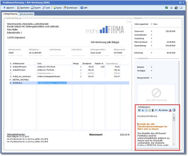 Das Standardbelegformular bietet auch die Möglichkeit, RTF-Texte mit Formatierung auszudrucken, bspw. eine RTF-formatierte Positionsnotiz mit Farben und fetter Schrift.