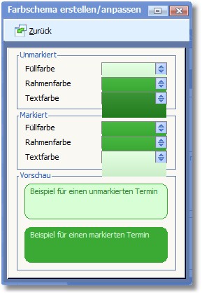 Diese Optionsmaske wird  über den Menüeintrag "Bearbeiten > Farbschema erstellen/anpassen" im Bearbeitungsdialog der Terminkategorien aufgerufen. Hier können Sie einstellen, wie Termine dieser Terminkategorie farblich dargestellt werden sollen, wenn Sie markiert bzw unmarkiert sind.