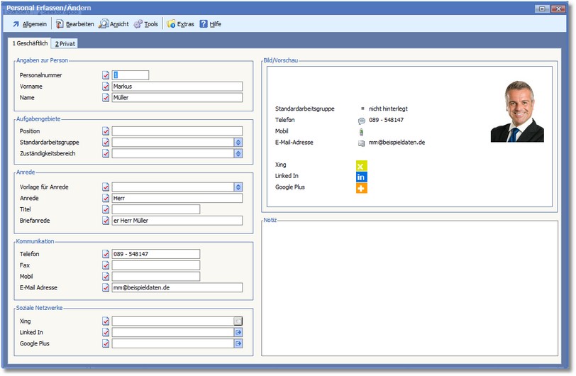 In diesem Dialogfenster werden die Daten der Mitarbeiter erfasst und bearbeitet.