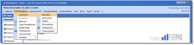1. Klicken Sie mit der Maus im Hauptmenü auf "CRM/OfficePlaner > Stammdaten > Basisdaten".