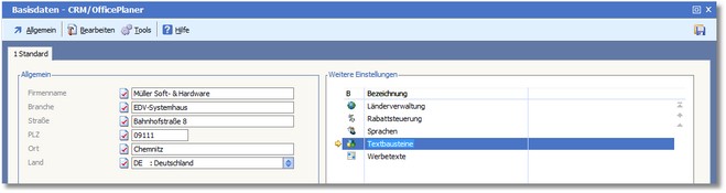 Die Basisdaten - CRM/OfficePlaner werden geöffnet.
