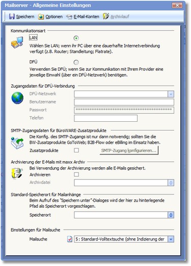 Der Bereich "SMTP-Zugangsdaten für BüroWARE-Zusatzprodukte"