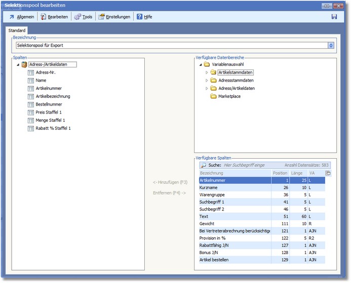 Navigation:  Warenwirtschaft > Stammdaten > Konditionen > Adress/Artikel > Selektionspool Adress/Artikel >