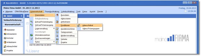 1. Klicken Sie mit der Maus im Hauptmenü auf "Warenwirtschaft > Stammdaten > Konditionen > Adress/Artikel".