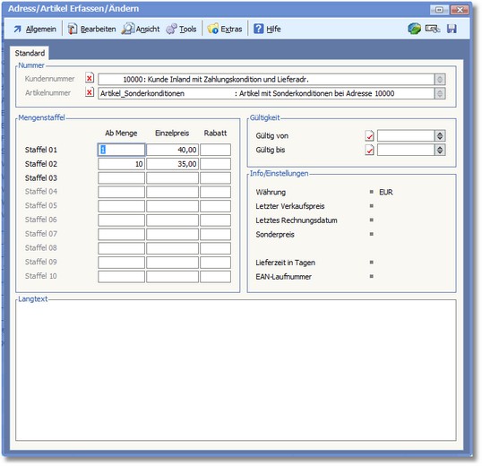 << Hier KLicken um eine Inhaltsübersicht anzuzeigen >> Navigation: Warenwirtschaft > Stammdaten > Konditionen > Adress/Artikel > Adress/Artikel anlegen und ändern |