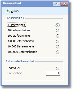 Hier wird durch die Aktivierung des entsprechenden Radiobuttons die Preiseinheit für den Artikel festgelegt. Vorgeschlagen wird die Preiseinheit, die im Artikelstamm für diesen Artikel hinterlegt ist.