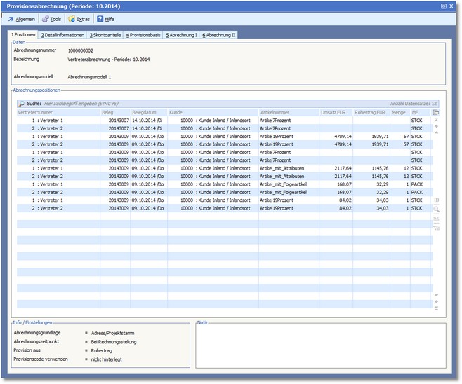 Die Maske zeigt die der Provisionsabrechnung zugrunde liegenden Belegpositionen.