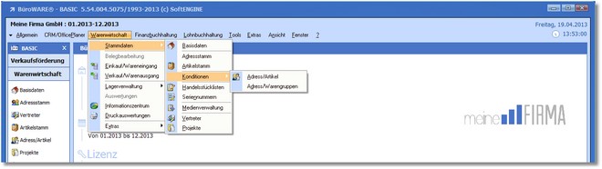 1. Klicken Sie mit der Maus im Hauptmenü auf "Warenwirtschaft > Stammdaten > Konditionen".