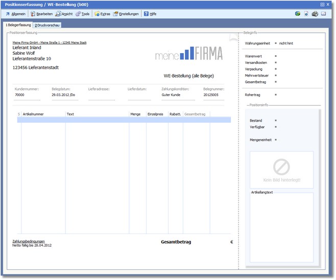 Das Programm öffnet die Positionserfassung für die WE-Bestellung.