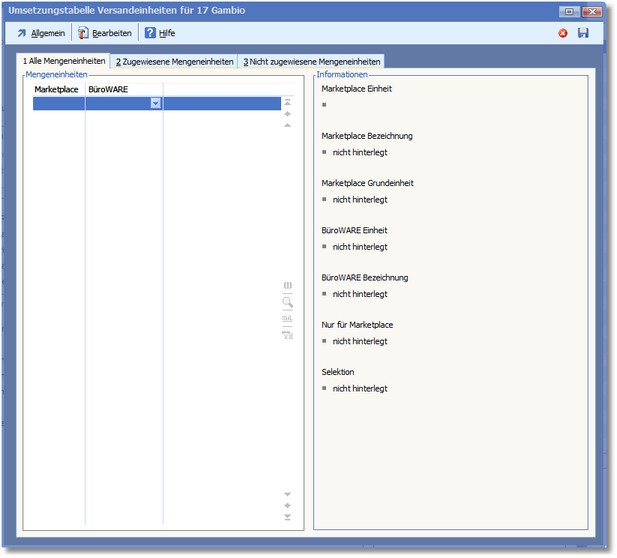 Hier wird die Zuweisung der Mengeneinheiten in der BüroWARE angezeigt.
