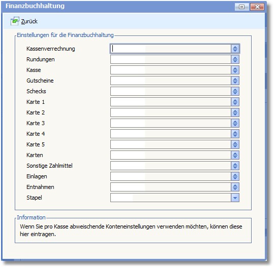 Unter dem Menüpunkt "Finanzbuchhaltung" könnten alternativ zu den globalen Einstellungen Konten angegeben werden, falls bei der FiBu-Übergabe für jede Kasse auf ein separates Konto gebucht werden soll.