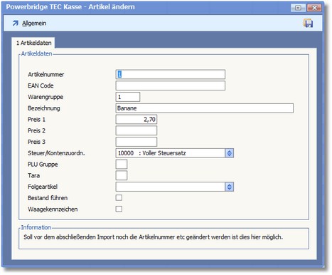 Navigation:  BüroWARE Powerbridge > TEC-Kassenschnittstelle > BüroWARE-Schnittstelle einrichten > Artikel importieren >