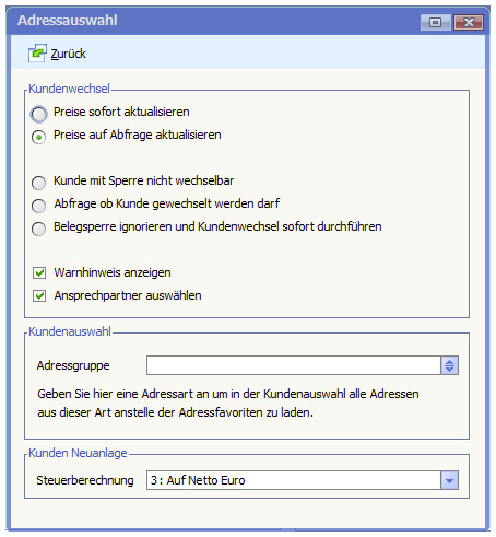 Steuern Sie mit den Einstellungen in diesem Bereich, wie sich die Preis- und Steueranpassung bei einem Kundenwechsel verhalten soll
