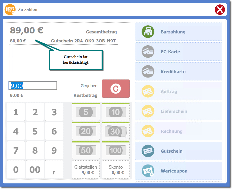 Wenn die Berechtigung gewährt wird, kann der Gutschein bei der Zahlung ausgewählt werden. Ohne Berechtigung wird ein solcher Gutschein nicht mit angezeigt.