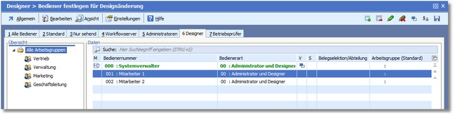 Hier können Sie einstellen, für welchen BüroWARE Bediener die Änderungen, die Sie in den Zugriffsrechten vornehmen, gespeichert werden. Bediener können Sie in der Tabelle mit den PLUS-/MINUS-Tasten sowie über das Kontextmenü der rechten Maustaste selektieren. Die Zugriffsrechte gelten in der Regel nur für die selektieren Bediener.