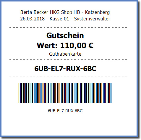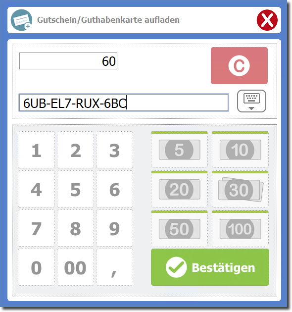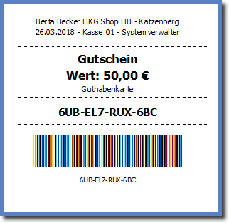 Dabei werden Guthabenkarten wie Gutscheine verwaltet. Um einen Gutschein als Guthabenkarte zu nutzen, können Sie den Wert über die Funktion "Guthaben aufladen" wieder aufladen.