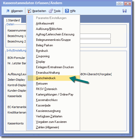 In den Kassenstammdaten wählen Sie dann im Menü "Bearbeiten" ➜ Menüeintrag "Gutscheindruck".