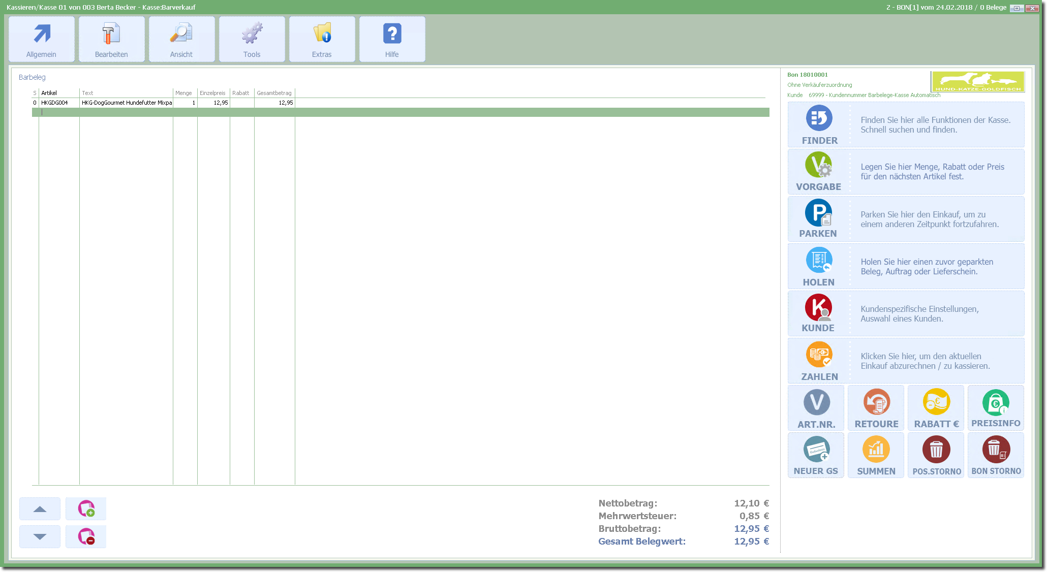 Die Erfassungsmaske für einen neuen BON wird angezeigt und es können Verkaufsvorgänge durchgeführt werden.