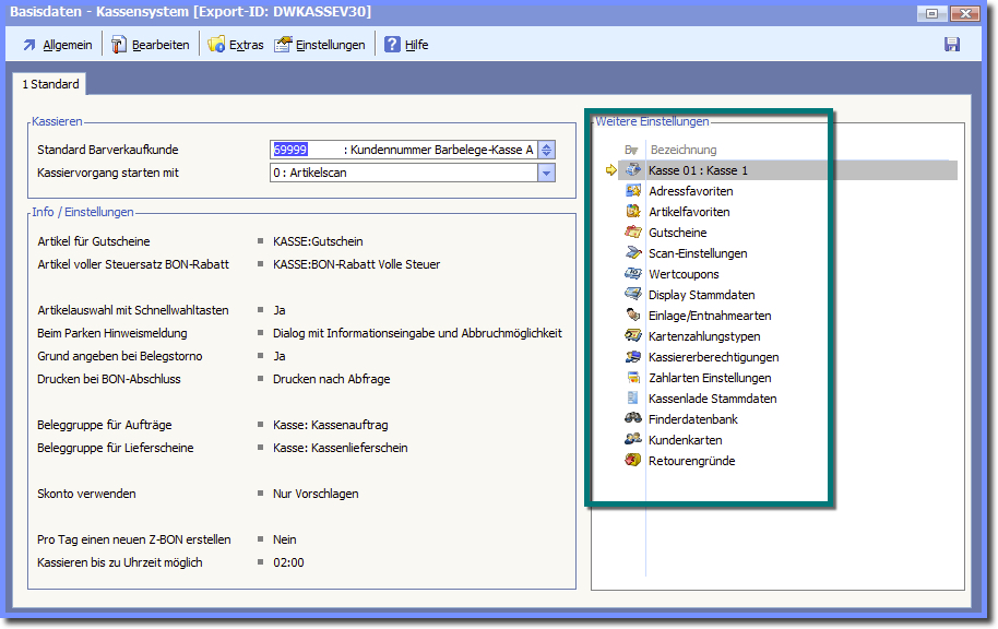 << Hier KLicken um eine Inhaltsübersicht anzuzeigen >> Navigation: Kassensystem > Technische Informationen (Systeminformation) > Vorbereitende Arbeiten > Grundeinrichtung der Kasse > Detaileinrichtung der Kasse (Basisdaten) > Weitere Einstellungen |