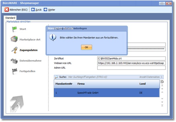 6. Wählen Sie hier einen der in der Tabelle angezeigten Mandanten aus und klicken Sie auf <Weiter>.