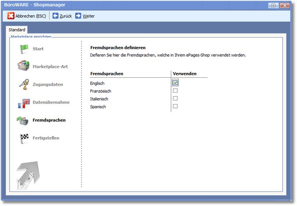 7. Legen Sie hier durch Aktivierung der entsprechenden Optionen die Fremdsprachen fest, mit denen Sie in Ihrem Shop arbeiten und klicken Sie auf <Weiter>.