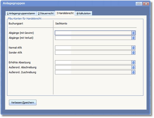 << Hier KLicken um eine Inhaltsübersicht anzuzeigen >> Navigation: Anlagenbuchhaltung > Stammdaten > Anlagegruppen > Die Karteikarte "Handelsrecht" |
