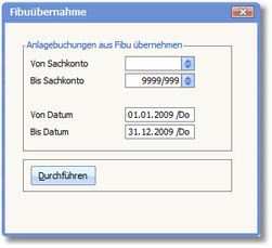 Mittels des Buttons <Übernahmelauf starten> öffnet sich ein weiterer Dialog, der es ermöglicht, die Buchungen auf Anlagegutkonten aus der Finanzbuchhaltung in die Tabelle einzulesen. Über folgende Felder können Sie bestimmen, welcher Buchungsbereich eingelesen werden soll.