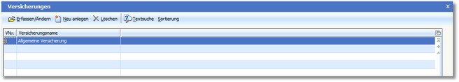Mit der [F3]-Taste oder dem Button <Neu anlegen> wird eine neue Versicherung angelegt. Mit der [RETURN]-Taste können Sie einen bestehenden Datensatz bearbeiten.