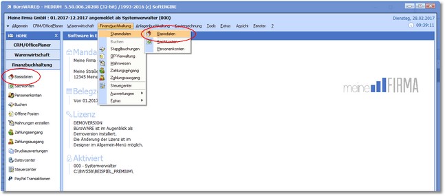 1. Klicken Sie mit der Maus im Hauptmenü auf "Finanzbuchhaltung > Stammdaten > Basisdaten"