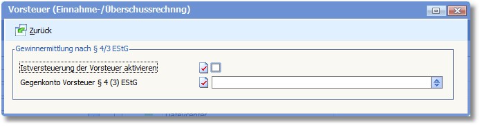 Hier werden Einstellungen zum Vorsteuerabzug bei Einnahme-/Überschussrechnung hinterlegt: