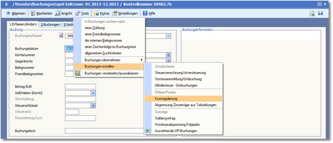 | 1. | Wählen Sie in der Buchungsmaske den Menüpunkt "Tools > Buchung erstellen > Kursregulierung". |