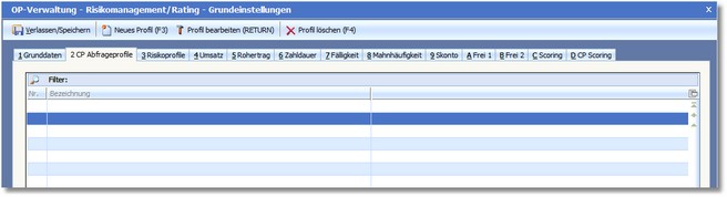 << Hier KLicken um eine Inhaltsübersicht anzuzeigen >> Navigation: Finanzbuchhaltung > OP-Verwaltung > Debitorenkennzahlen/Rating > Debitorenrating einrichten > Die Karteikarte "CP Abfrageprofile" |