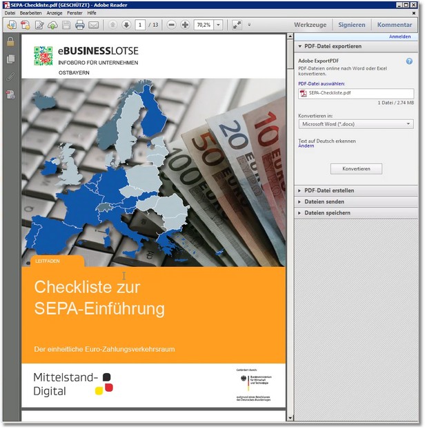 1. Klicken Sie im Assistenten zur Vorbereitung auf den SEPA-Zahlungsverkehr 2014 auf "Allgemeine Informationen über SEPA", um eine mitgelieferte PDF-Datei zu öffnen.
