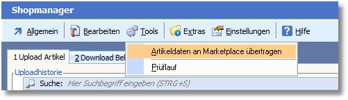 1. Markieren Sie im Shopmanager den gewünschten Marketplace und klicken Sie auf den Menüpunkt "Tools > Artikeldaten an (Marketplace) übertragen".
