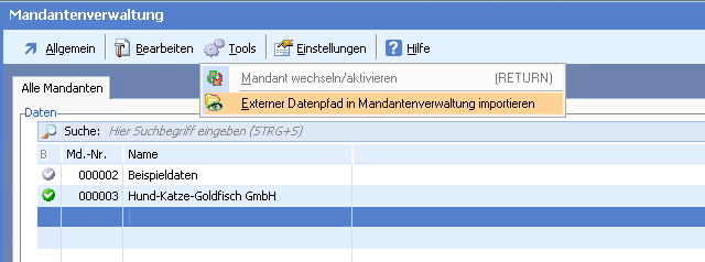 Hier finden Sie im Menü "Tools" den Eintrag "Externen Datenpfad in Mandantenverwaltung importieren".