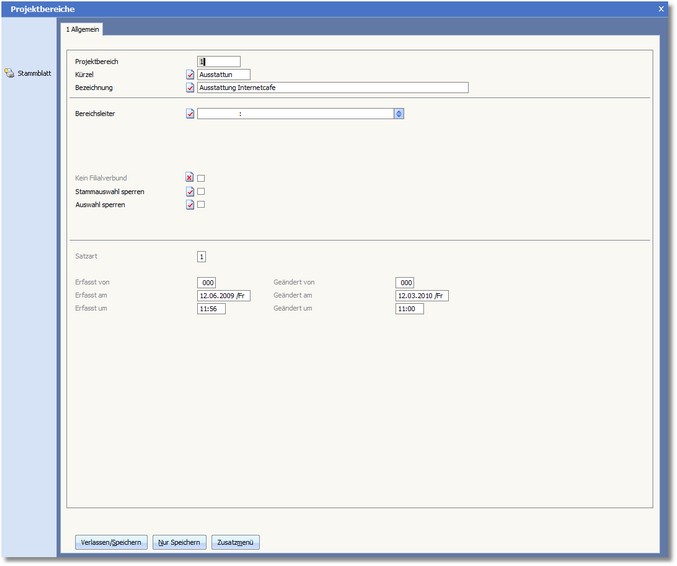 Diese Karteikarte nimmt die allgemeinen Daten zum Projektbereich auf.