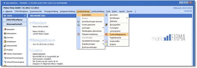 1. Klicken Sie mit der Maus im Hauptmenü auf "Kostenrechnung > Stammdaten > Kostenstellenbereiche".