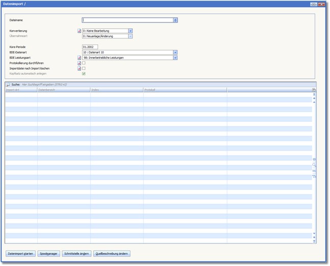 Hier können Sie kostenmäßige Leistungsdaten aus einer für das Programm aufbereiteten Schnittstellendatei übernehmen, die von externen Programmen erzeugt wurde (z.B. Maschinendaten etc.). Die Schnittstellendatei muss in einem Format vorliegen, das vom Programm standardmäßig gelesen werden kann (Importdefinition).