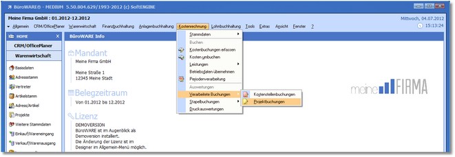 1. Klicken Sie mit der Maus im Hauptmenü auf "Kostenrechnung > Auswertungen > Projektbuchungen".