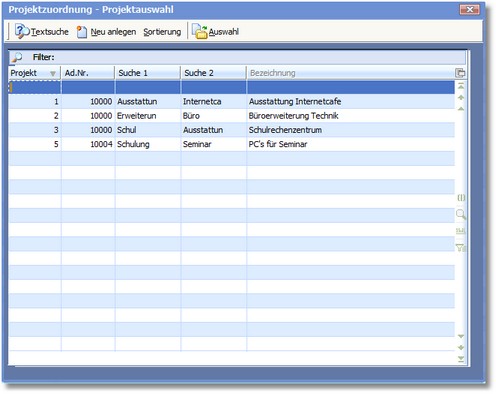 Das Programm öffnet die Auswahltabelle der Projekte, die in der Warenwirtschaft angelegt sind.
