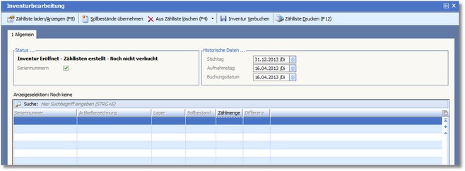 Das Programm öffnet die Inventurbearbeitung.