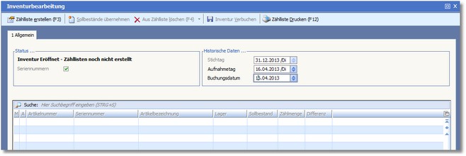 Als erster Schritt im Inventurablauf werden zunächst die Inventur eröffnet und die Zähllisten erstellt.