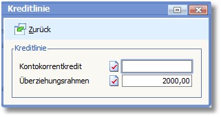 << Hier KLicken um eine Inhaltsübersicht anzuzeigen >> Navigation: Warenwirtschaft > Stammdaten > Basisdaten > Banken > Die Karteikarte "Standard" > Kreditlinie |