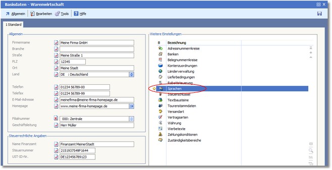 Die Sprachverwaltung ermöglicht die Definition von bis zu 99 Fremdsprachen. Außerdem besteht die Möglichkeit, die Belegübernahmetexte in der jeweiligen Fremdsprache zu erfassen.