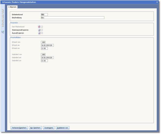 [F10] speichert die Eingaben und kehrt zur vorgelagerten Auswahltabelle der Mengeneinheiten zurück.