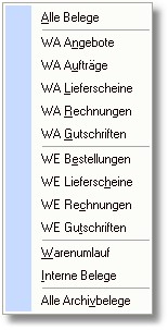 Über diesen Button können Sie die einzelnen Belege des gewählten Projektes in einer Tabelle auflisten. Zuvor können Sie in einem Pop-Up-Menü auswählen, ob Sie alle Belege, spezielle Belegarten (z.B. nur Rechnungen) oder nur Archivbelege beauskunften möchten.