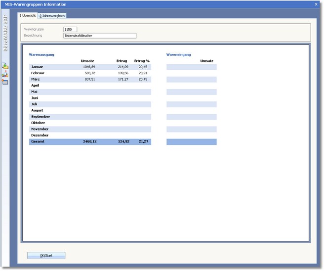 In der Karteikarte "Übersicht" werden Informationen der Warengruppe über Umsätze und Erträge des aktuellen Jahres angezeigt.