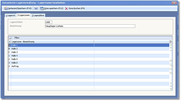 Tragen Sie hier die Lagerzonen ein, in die ihr Lagerort unterteilt ist. Sollten Sie nur über eine Zone verfügen, legen Sie nur eine an.